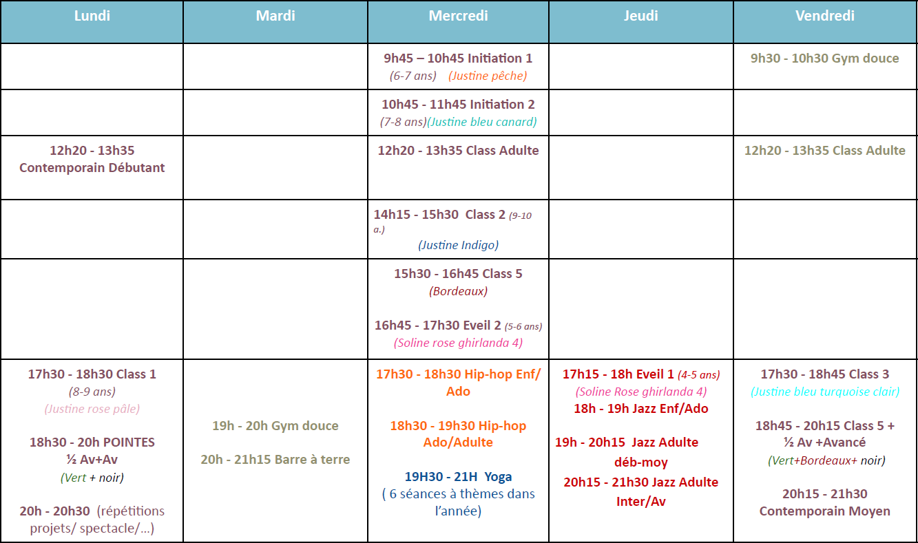 Voici l’ensemble des cours que nous vous proposons au sein de notre Ecole de danse : Eveil & Initiation à la danse, Classique, Contemporaine, Jazz, Hip Hop, Barre à terre, Gym Douce, et Yoga.